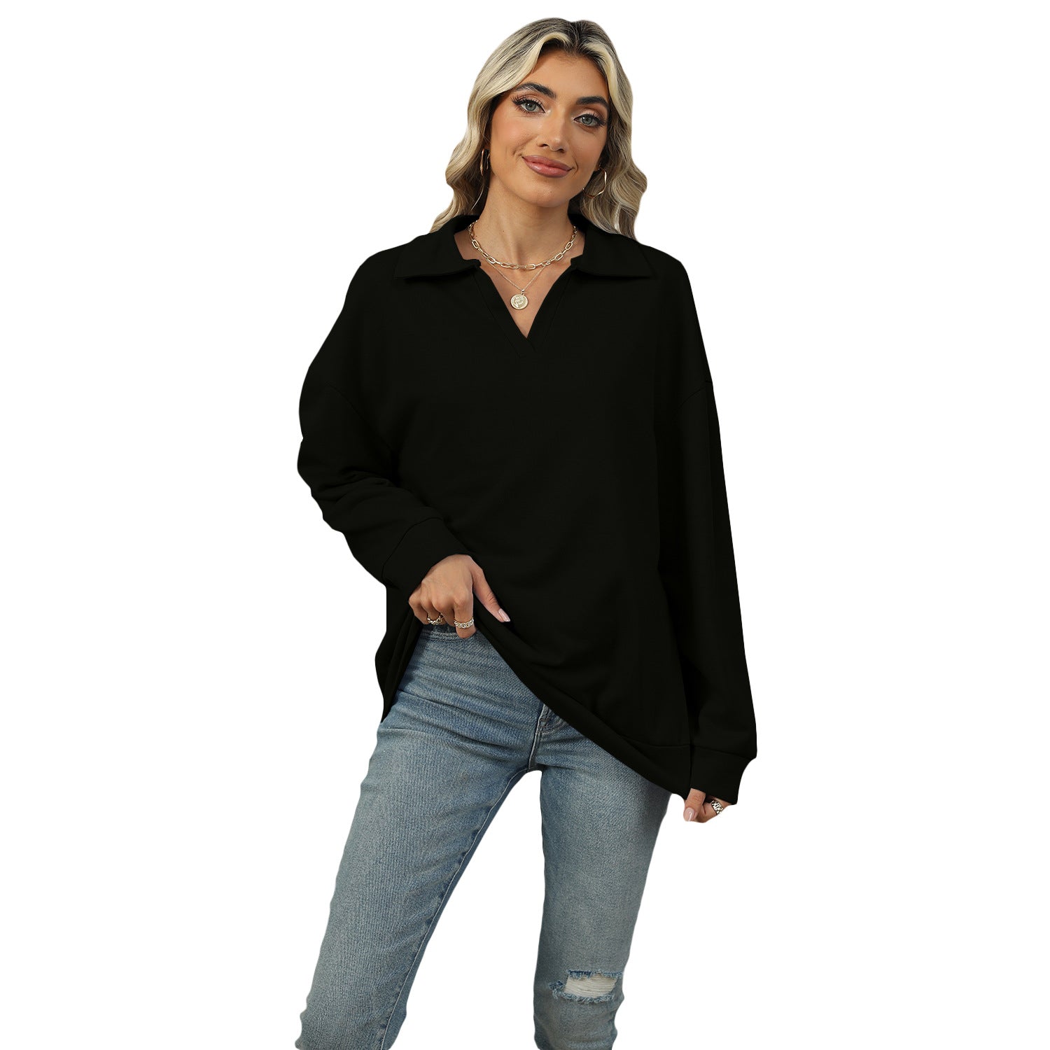 New Lapel V-neck Sweatshirt Fashion Casual Loose Solid Color  Long-sleeved Pullover Top For Womens Clothing